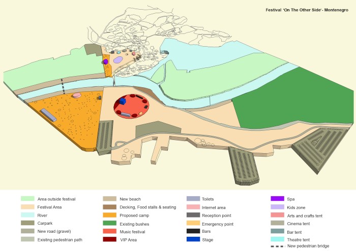 The project encompasses a schematic master plan for an ecological music festival, located in the village of Dodoši, Montenegro. The event has been set on a site of spectacular natural site, on the Lake Skadar where, during the summer months, it withdraws and exposes the river underneath its surface and the surrounding vegetation. The festival is planned to accommodate 15,000 people on a surface area of 325,000m², including an events stage, an arts and crafts zone, food and beverage market stalls, as well as camping and parking areas. |